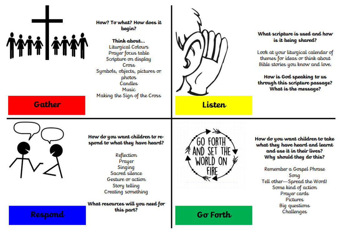 Our first group of Faith leaders four years ago spent a great deal of time designing a guidance frame for use during each of the four stages of Child-led Celebration of the Word, to help prompt thoughts and ideas during the planning process.