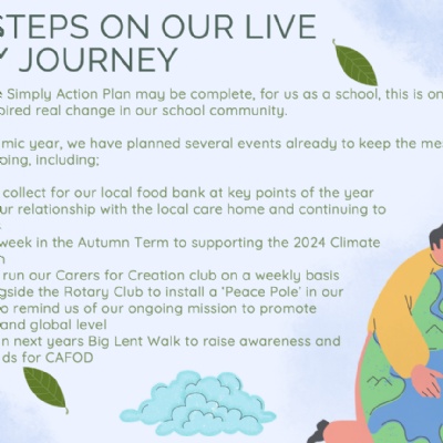 We are delighted to inform you that through our actions and simple living, we  achieved the Live Simply Award! We are delighted to inform you that through our actions and simple living this year, we have achieved the Live Simply Award.